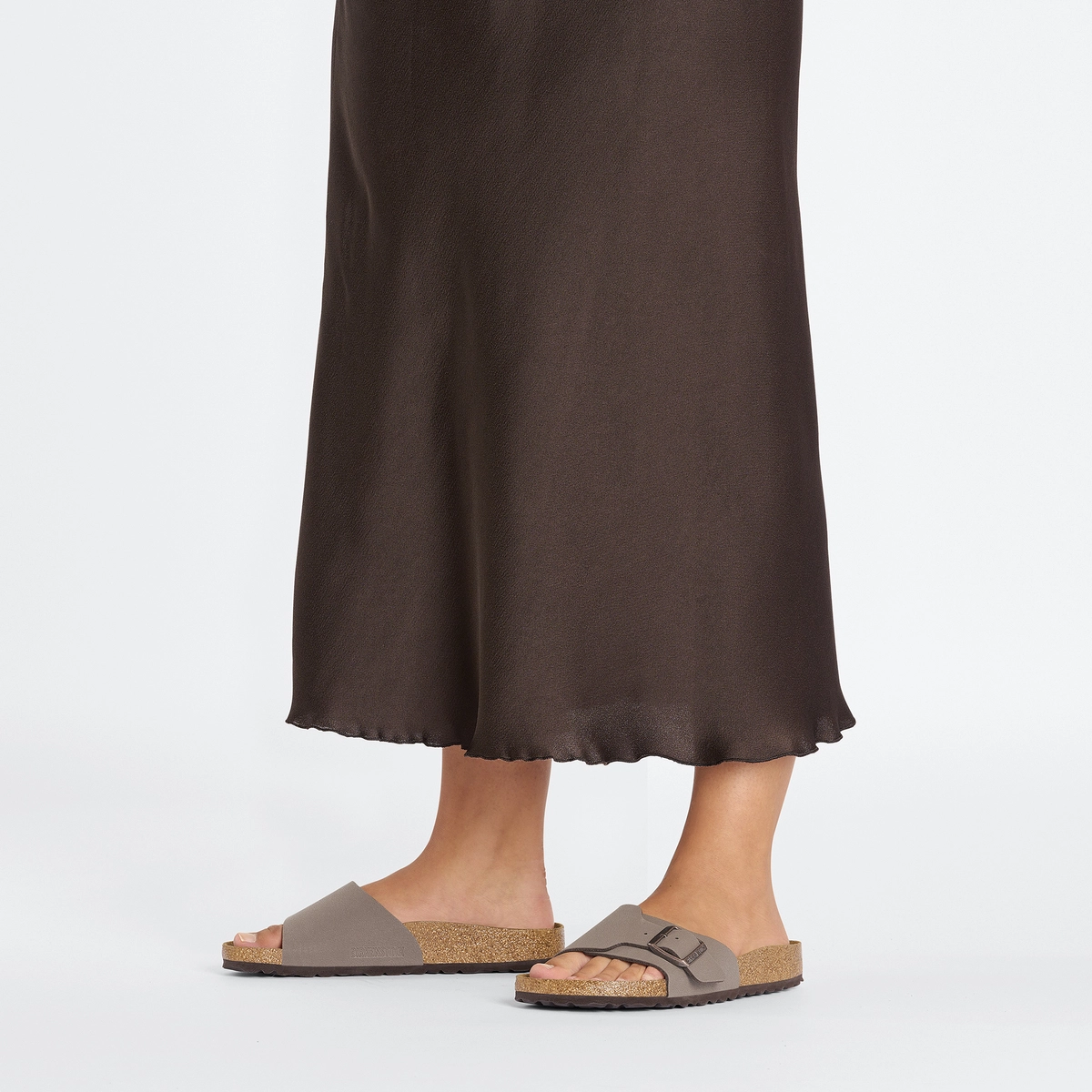 Das Design des Modells Catalina von BIRKENSTOCK basiert auf dem beliebten klassischen Modell Madrid mit Riemen und Metallschnalle. Die Flip-Flops überraschen mit einem verbreiterten Riemen, der den Schuhen einen modernen, unverwechselbaren Charakter verleiht. Der raffinierte Look der Schuhe wird durch eine farblich perfekt abgestimmte Innensohle abgerundet. Das Obermaterial besteht aus dem hautfreundlichen, robusten Synthetikmaterial Birko-Flor® in einer raffinierten Nubuk-Ausführung, die strukturell und farblich dem Naturleder ähnelt.