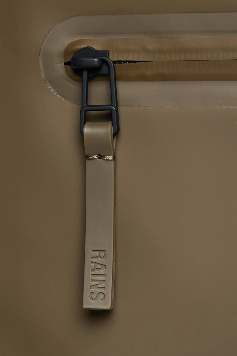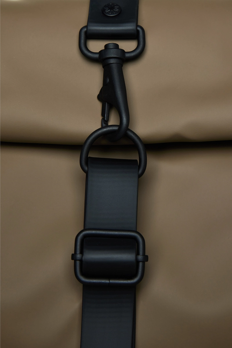 Der Rolltop-Rucksack ist aus dem charakteristischen wasserdichten PU-Gewebe von Rains gefertigt, das für Stärke, Haltbarkeit und ein angenehmes Tragegefühl sorgt.