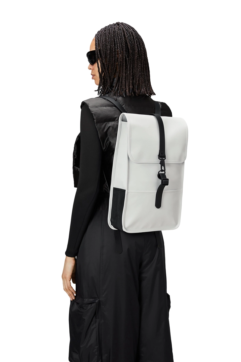 Plecak Mini to zmniejszona wersja Plecaka. Sylwetka charakteryzuje się wydatną klapą i centralnym paskiem zapinanym na karabińczyk. Ten czysty i zawsze nowoczesny wodoodporny plecak ma wewnętrzną kieszeń na laptopa, komorę główną i ukrytą zewnętrzną kieszeń na telefon na tylnym panelu.