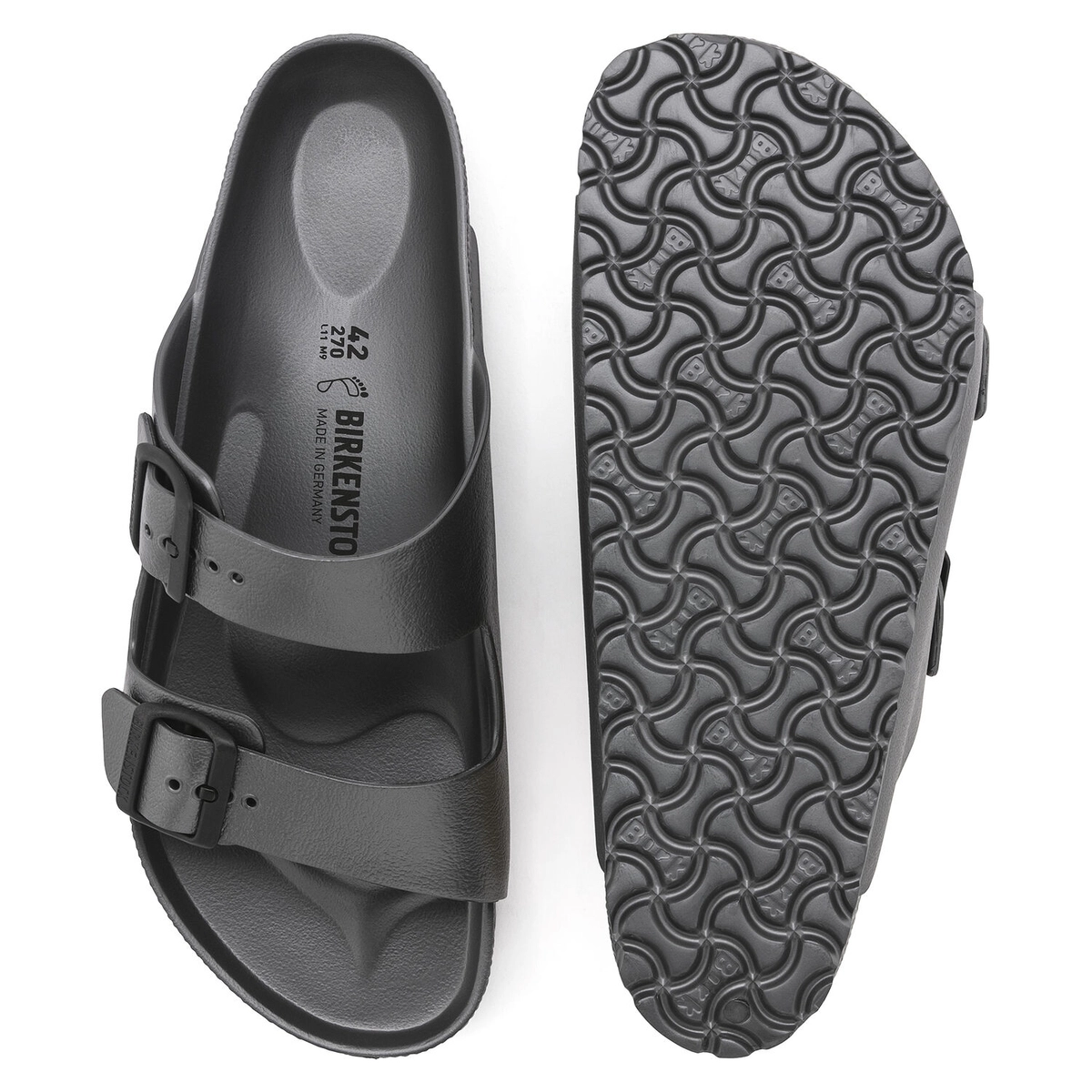 BIRKENSTOCK Arizona sandal is a true classic. This cork sandal patterned model is made of EVA foam. High-quality EVA plastic is odorless and tested for possible contamination, and it combines various properties: the plastic is very light and flexible, water-resistant and skin-friendly, and it offers the typical BIRKENSTOCK wearing comfort.
