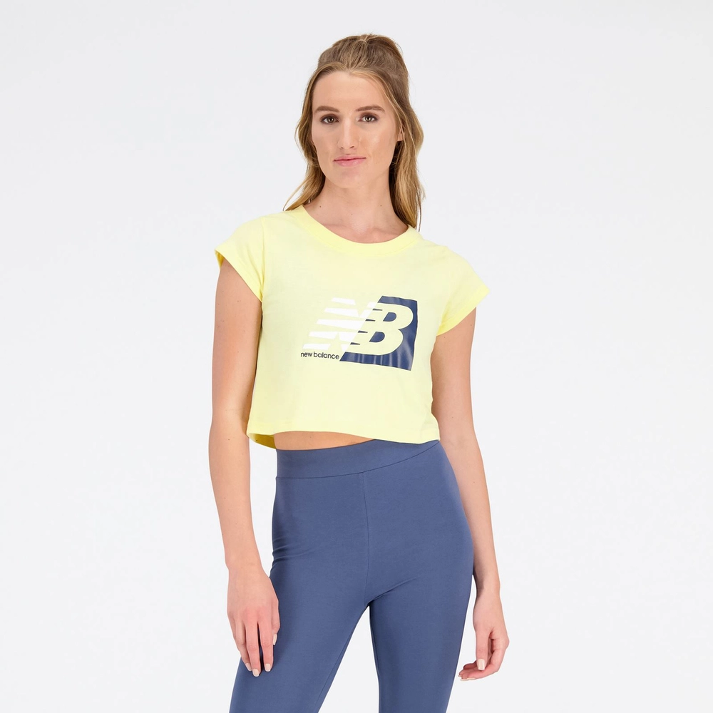 Women's short sleeve T-shirt with brand logo graphics and New Balance lettering.