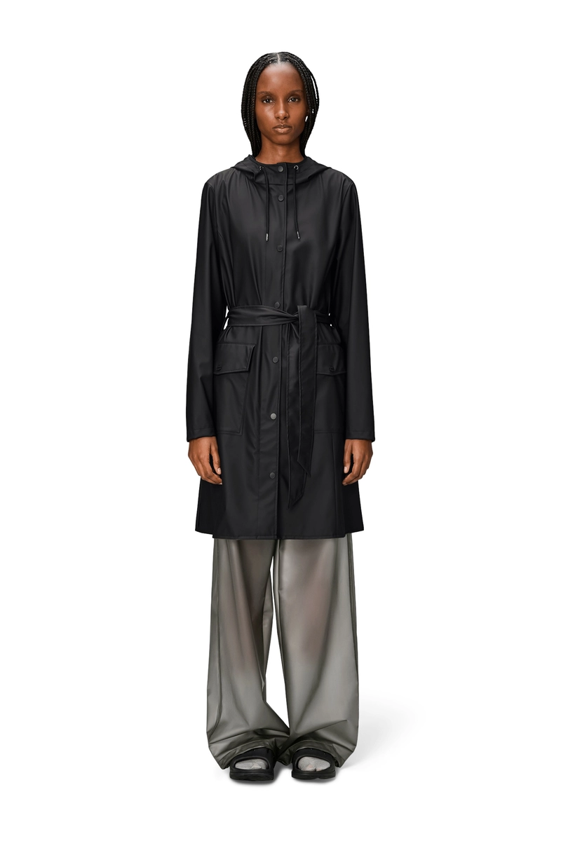 This design with a minimalist silhouette is an interpretation of a women's trench coat Rains. The design is flattering to the figure and highly functional.
