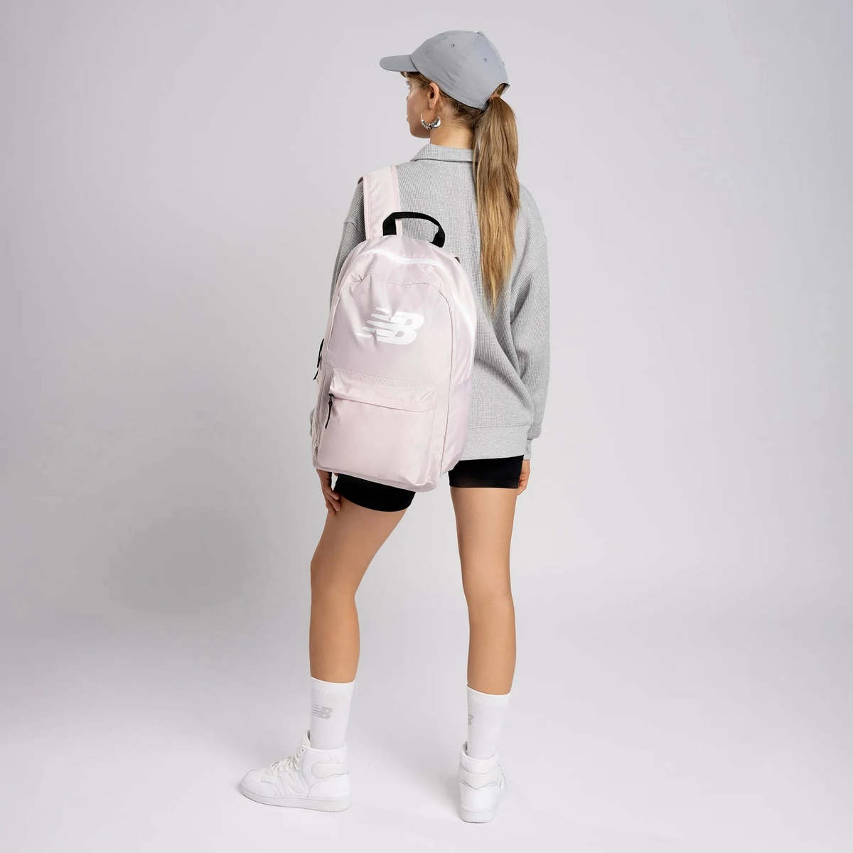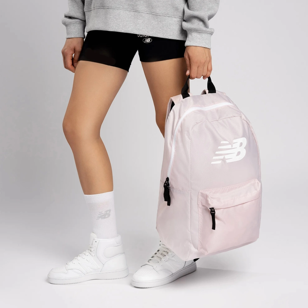 Na przodzie plecaka znajduje się duże logo New Balance.