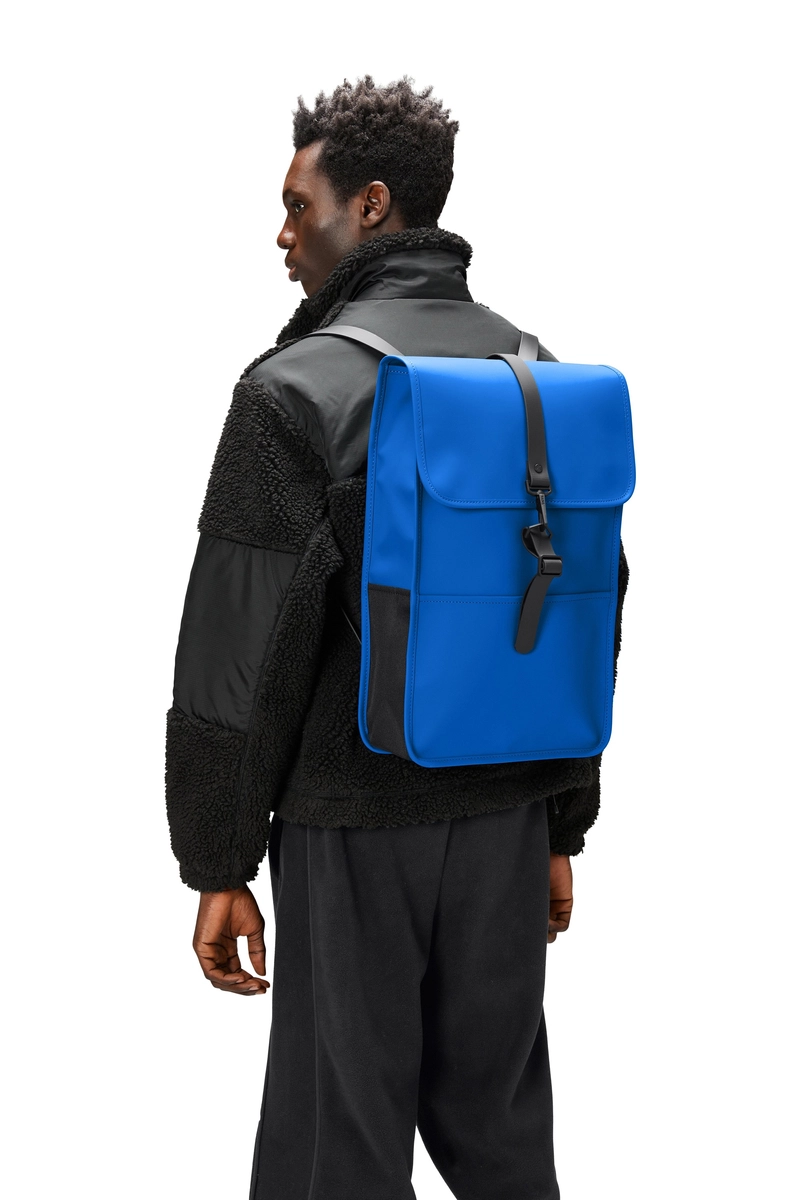 Plecak jest wykonany z charakterystycznej dla firmy Rains wodoodpornej tkaniny PU, zaprojektowanej z myślą o wytrzymałości, trwałości i gładkości.
