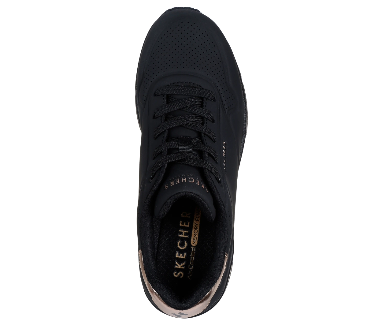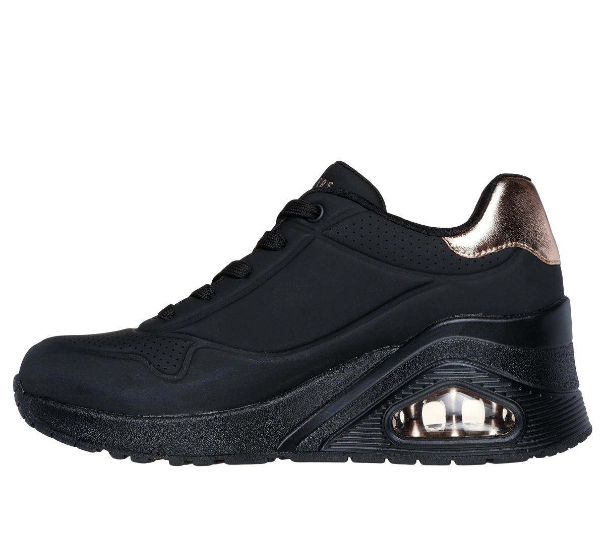 Wzbogać garderobę o większy komfort za sprawą Skechers Street™ Uno Wedge – HI Steps. Modny styl z cholewką z durabuku z metalicznym wykończeniem ze skóry syntetycznej, wkładką Skechers Air-Cooled Memory Foam i koturnem z podeszwą środkową z widoczną poduszką powietrzną Skech-Air®.