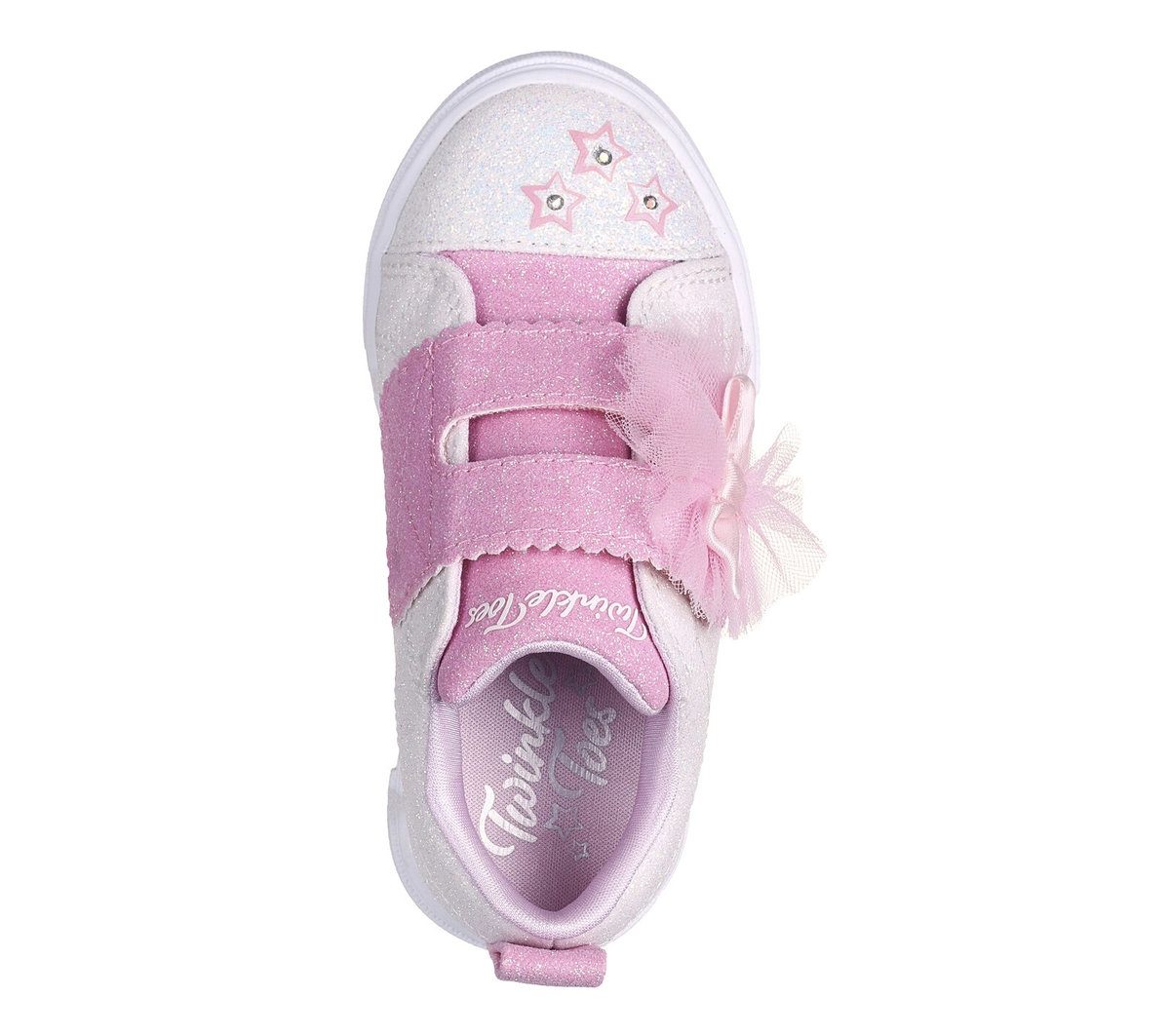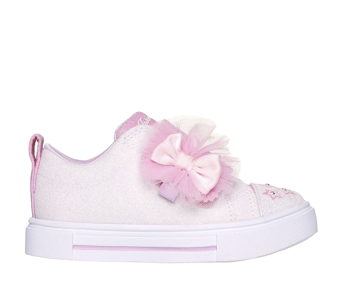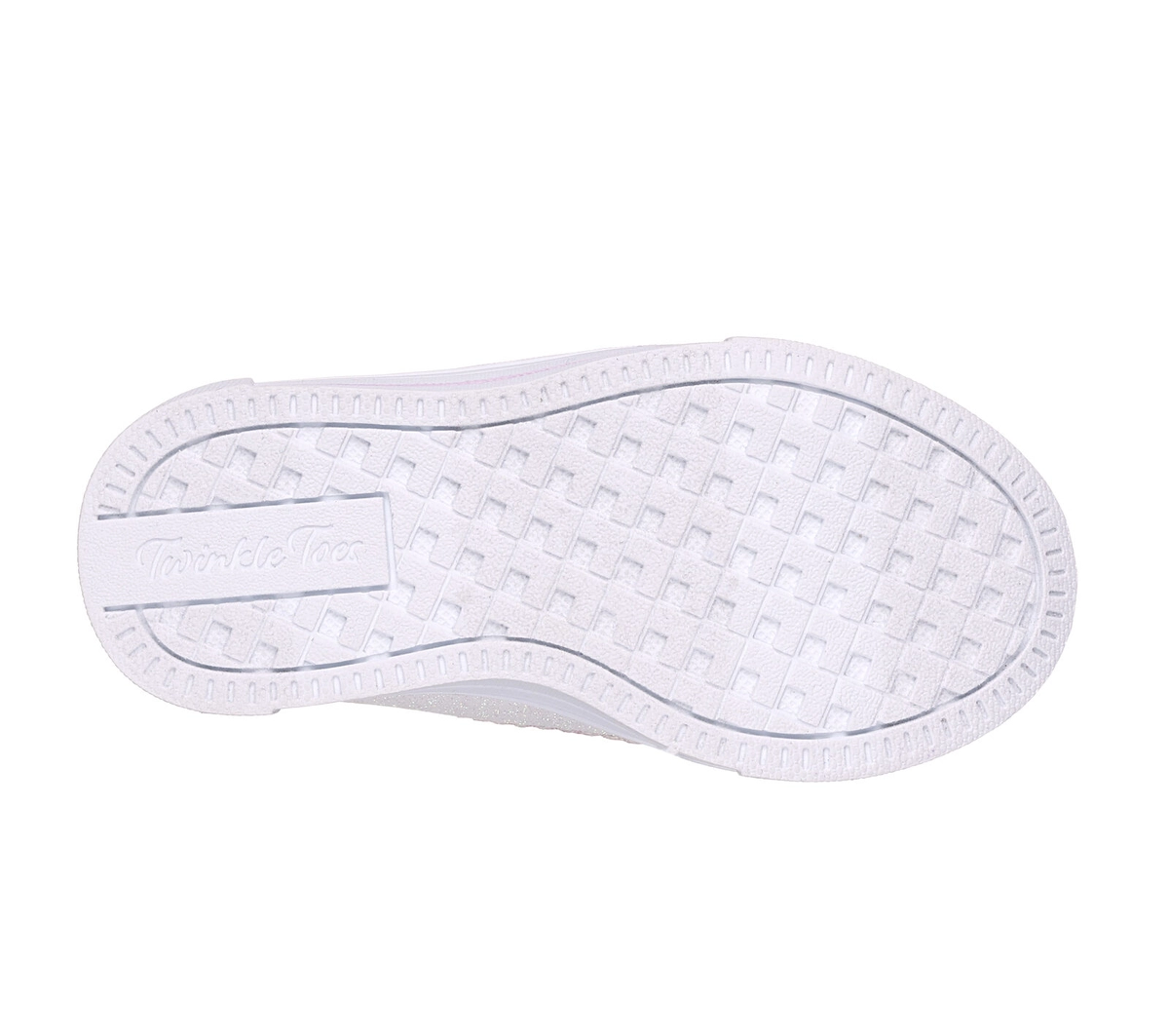 Błyszcz i lśnij jak największe gwiazdy w Skechers Twinkle Toes®: Twinkle Sparks – Glitter Gems. Podświetlany model z brokatową, syntetyczną cholewką, regulowanym paskiem na podbiciu z tiulowym akcentem i kokardką oraz ozdobionym kryształkami noskiem.