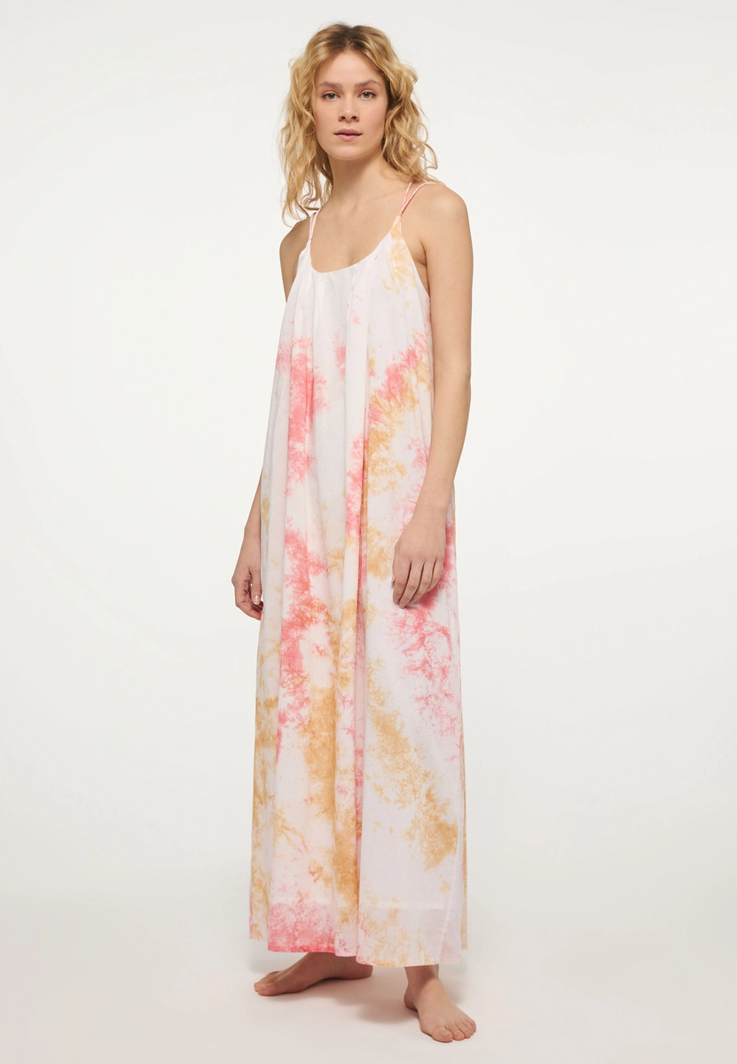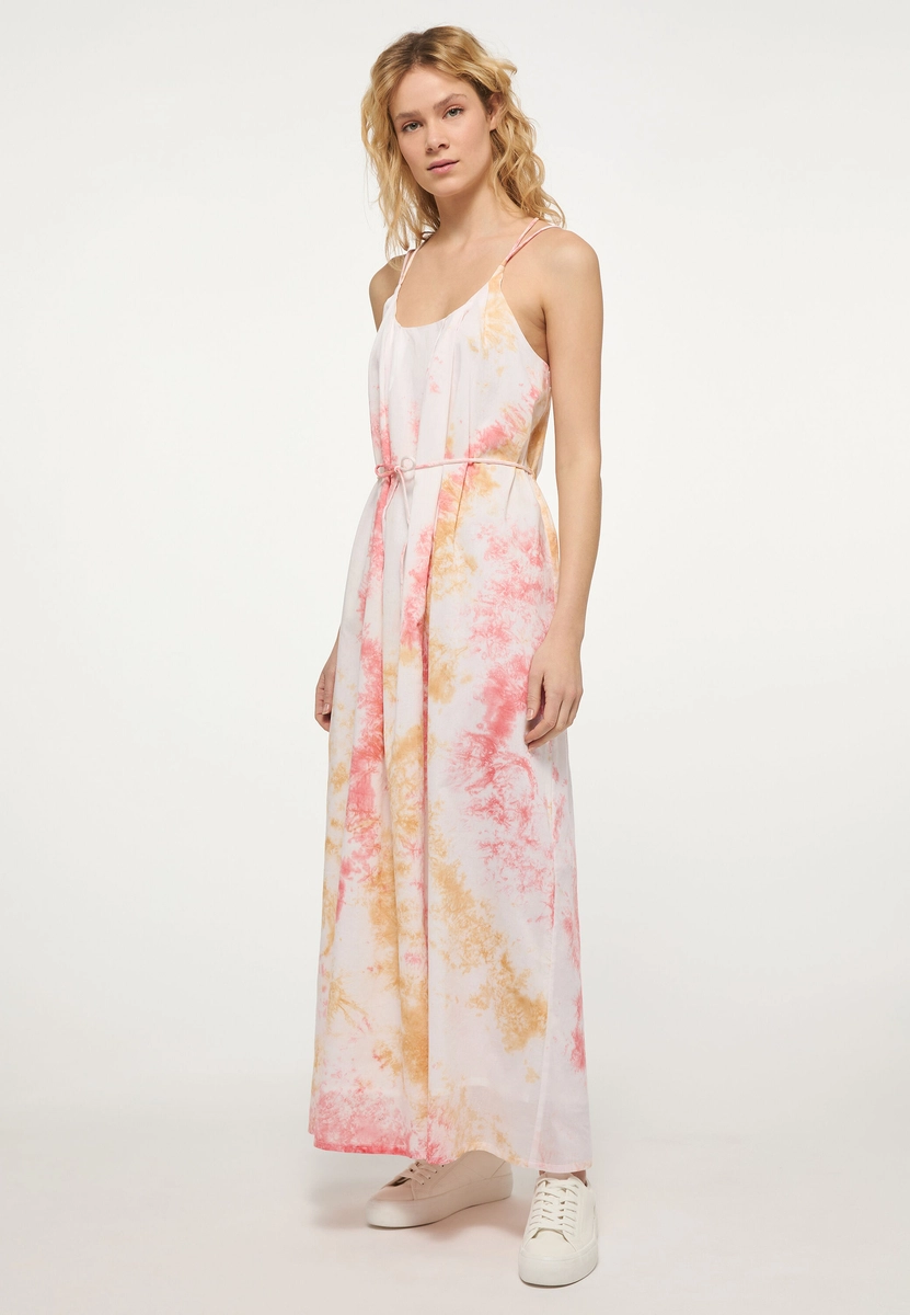 Ta sukienka Mustanga zachwyca już na pierwszy rzut oka swoim wspaniałym wyglądem retro. Wykonany z miękkiej bawełny zapewnia przewiewność i lekkość, a dzięki praktycznemu paskowi do wiązania można indywidualnie dopasować szerokość. Dekolt w kształcie litery V, ramiączka typu spaghetti i wzór tie-dye nadają modelowi romantyczny charakter.