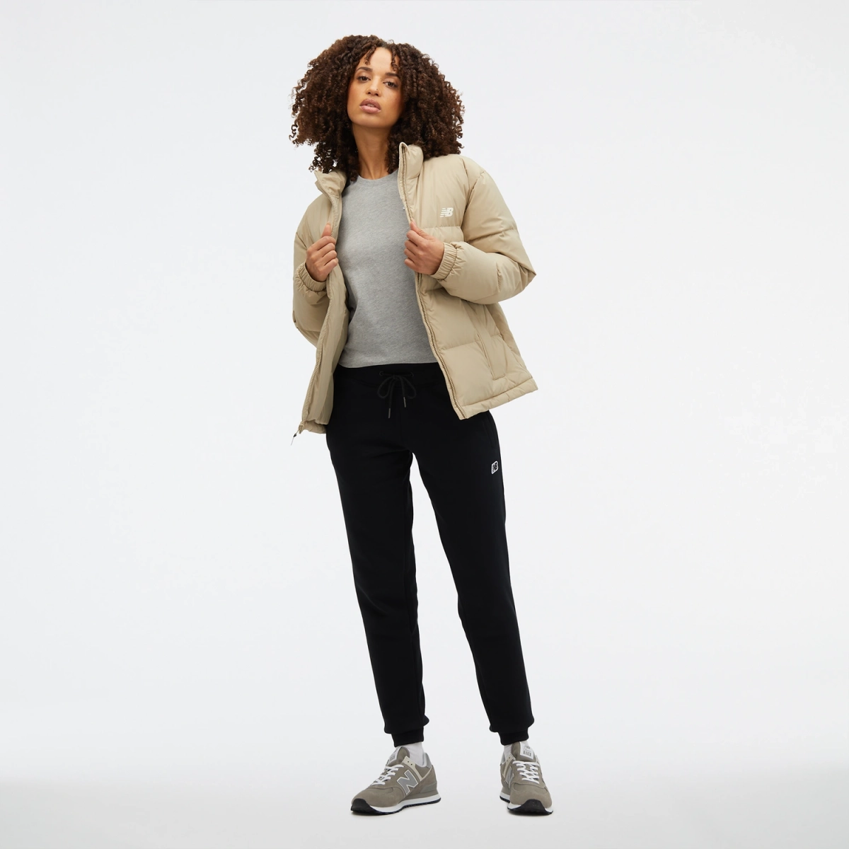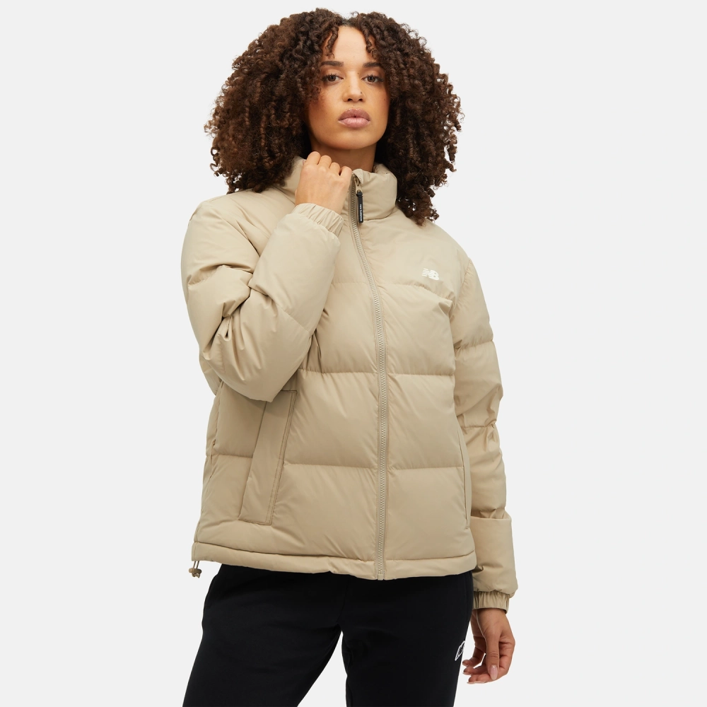 Damska kurtka puffer z wysokim kołnierzem i niewielkim logotypem New Balance umieszczonym na piersi.
