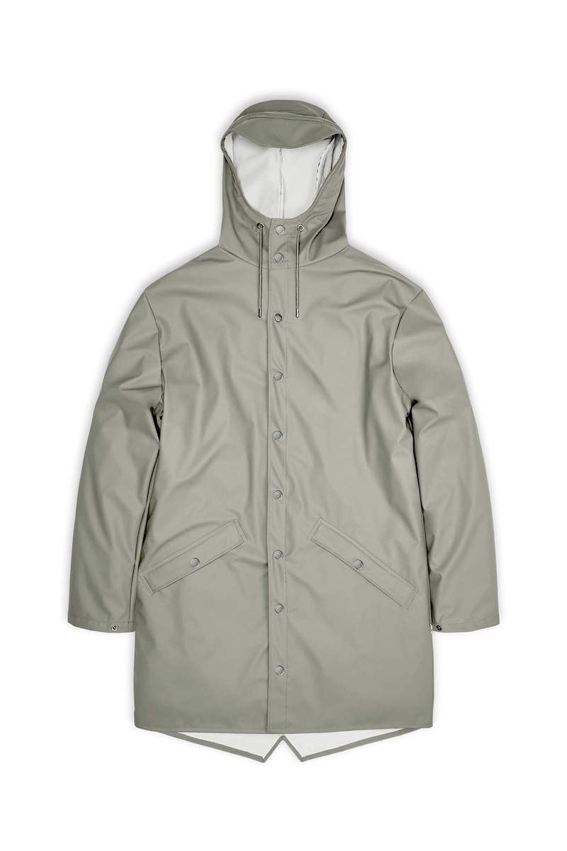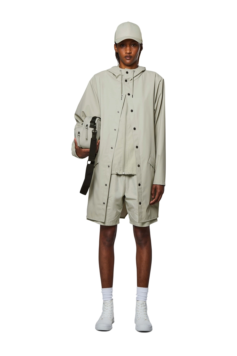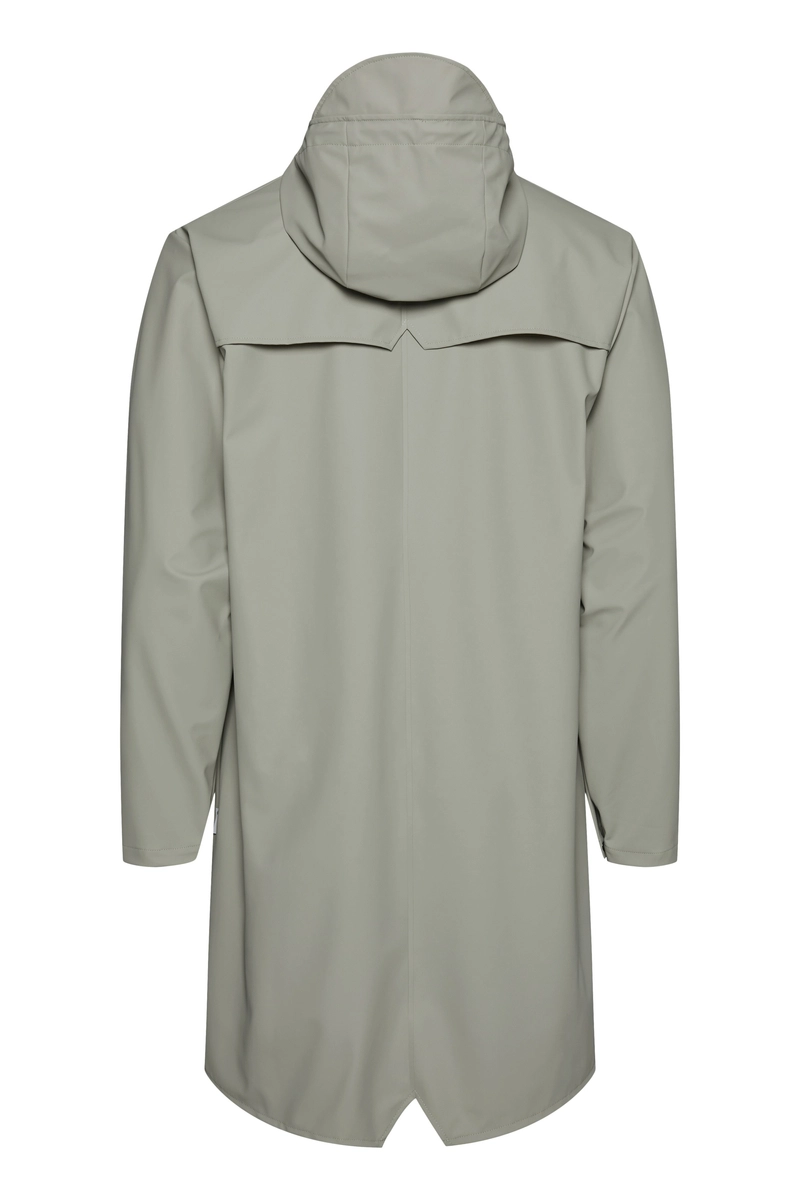 Long Jacket to dłuższa wersja klasycznego projektu Rain, Jacket. Ta zawsze współczesna kurtka przeciwdeszczowa unisex zapewnia wysoką funkcjonalność w minimalistycznej sylwetce. Cechy obejmują podwójnie zgrzewane ukośne kieszenie z klapami, regulowane mankiety i lamówkę typu fishtail. Całości dopełniają zatrzaski, szlufki pod pachami i tylny karczek z ukrytymi rozcięciami.