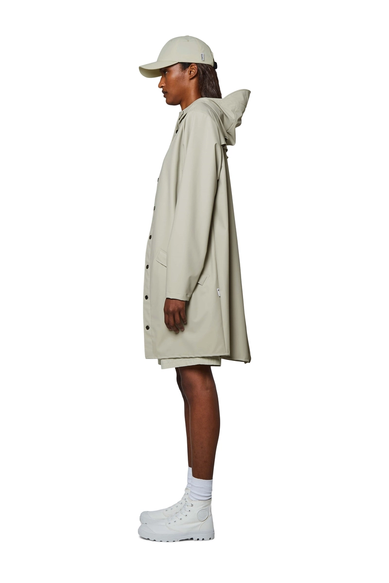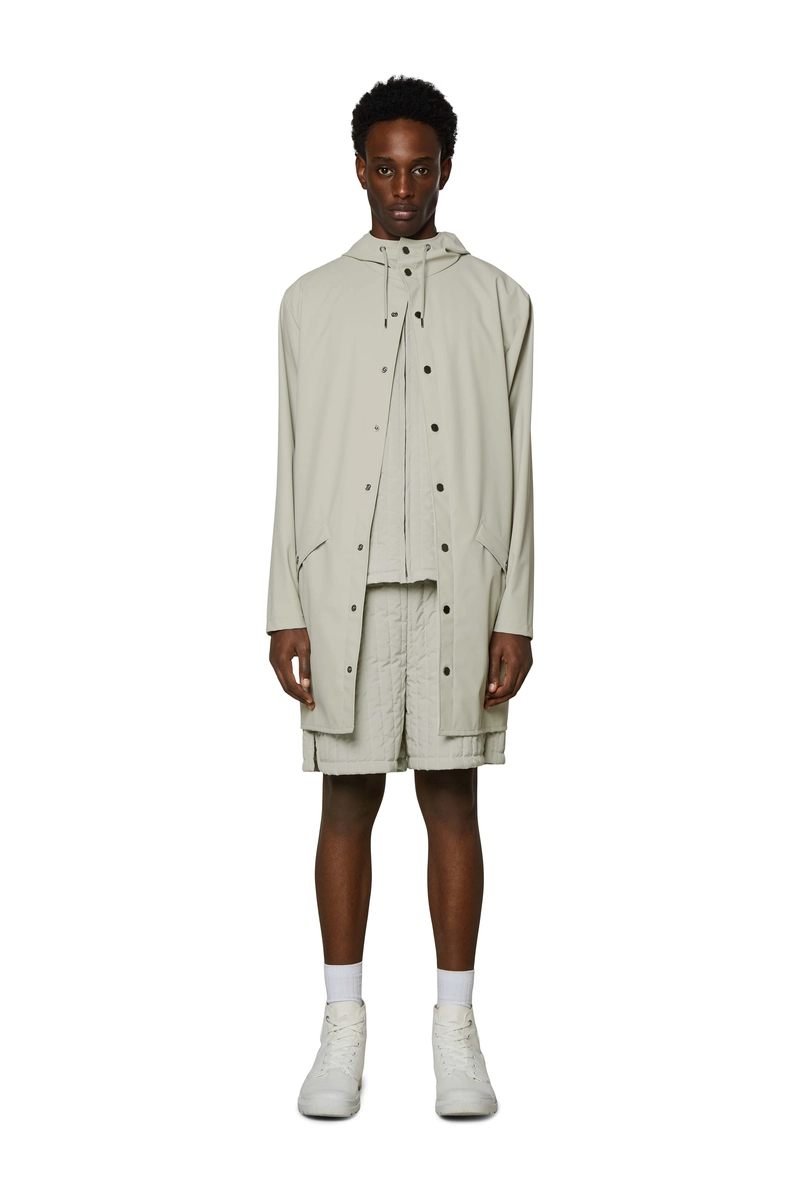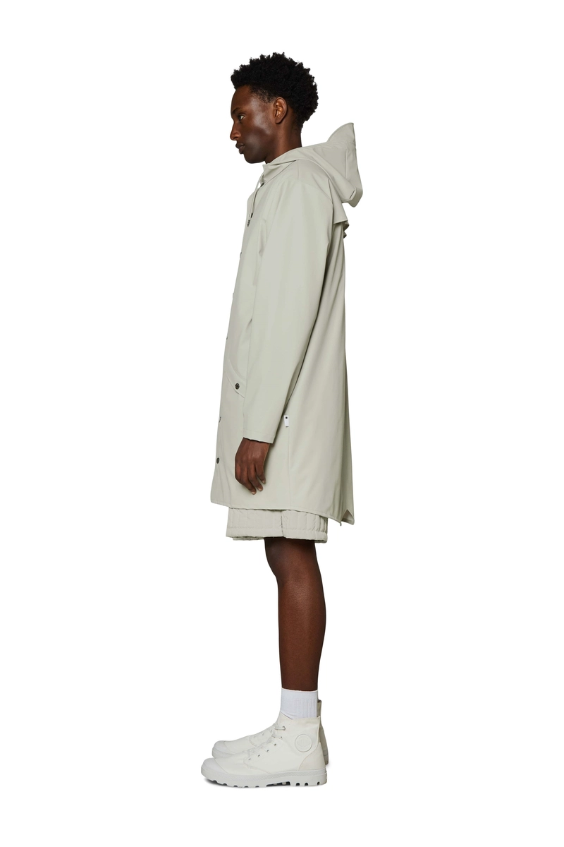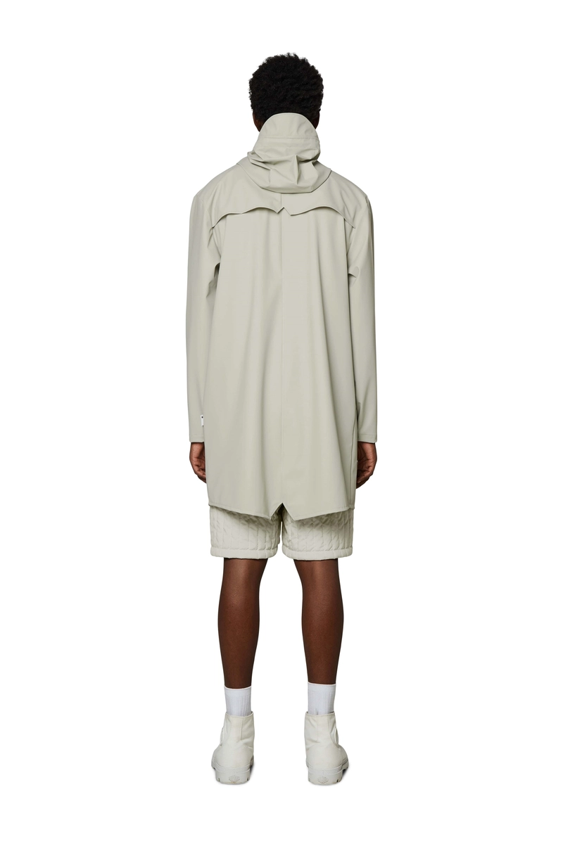Long Jacket to dłuższa wersja klasycznego projektu Rain, Jacket. Ta zawsze współczesna kurtka przeciwdeszczowa unisex zapewnia wysoką funkcjonalność w minimalistycznej sylwetce. Cechy obejmują podwójnie zgrzewane ukośne kieszenie z klapami, regulowane mankiety i lamówkę typu fishtail. Całości dopełniają zatrzaski, szlufki pod pachami i tylny karczek z ukrytymi rozcięciami.