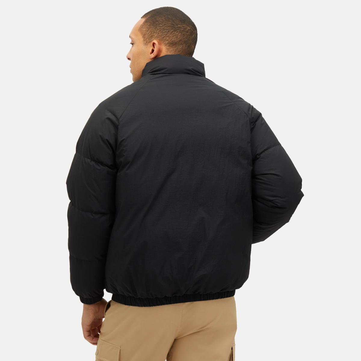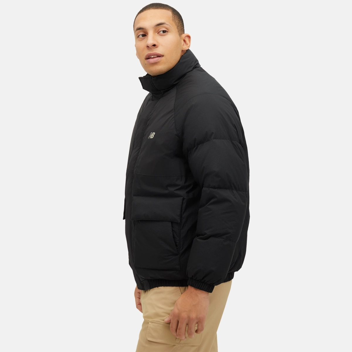 Męska kurtka puchowa z wysokim kołnierzem i niewielkim logotypem New Balance umieszczonym na piersi.