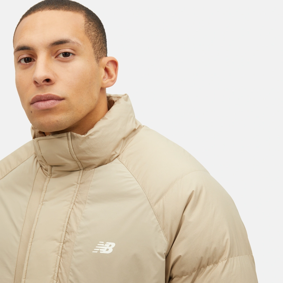 Męska kurtka puchowa z wysokim kołnierzem i niewielkim logotypem New Balance umieszczonym na piersi.